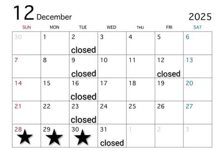 ★28日から30日 軽食、デザート、ドリンクのみ ⏰11:30~17:30 (LO16:30) ※12月から2月はバーガーのご提供はございません。 営業時間 OPEN 11:00 CLOSED 17:30 ( LO16:30 )