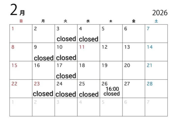 2026年2月の定休日